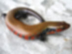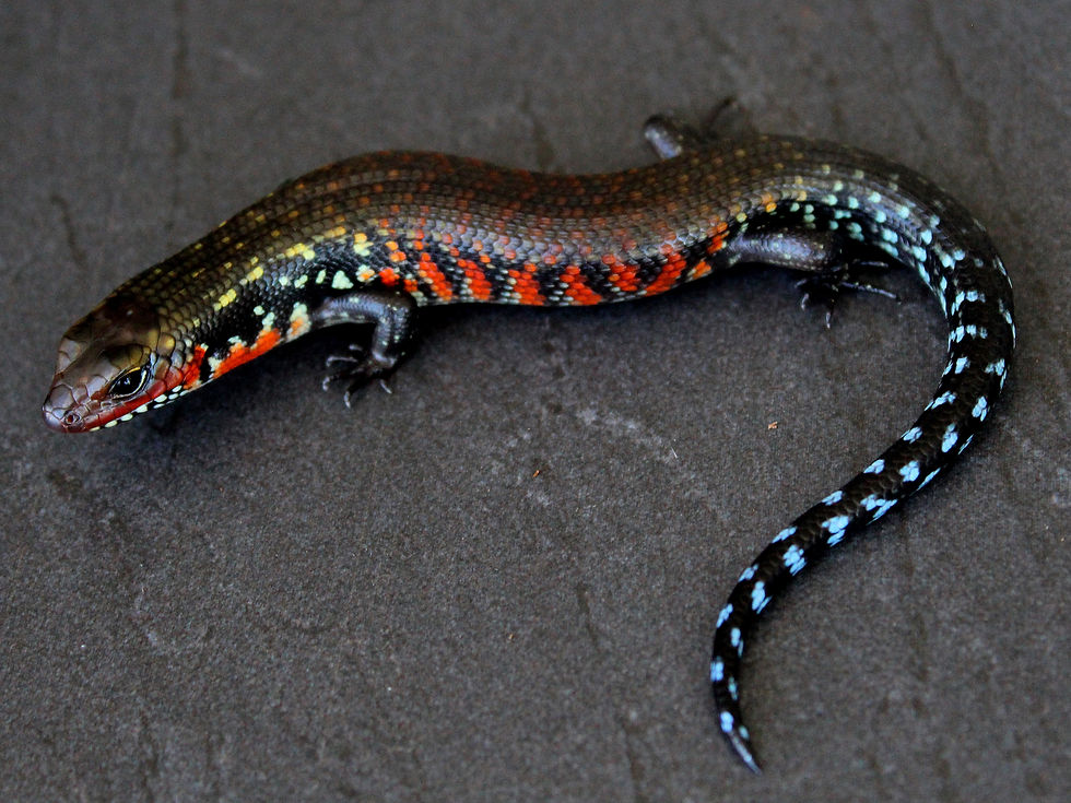 El escinco de fuego (Lepidothyris fernandi), también conocido como Fire Skink, es uno de los reptiles más llamativos del mundo. Su cuerpo brillante en tonos rojo, naranja y dorado metálico, combinado con bandas negras y un lomo iridiscente, lo convierte en una verdadera joya viviente que parece sacada de un cuento fantástico.